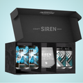 A beautifully presented Gift Box containing two cans each of our flagship gluten free beers, with a Siren patterned glass in the centre.